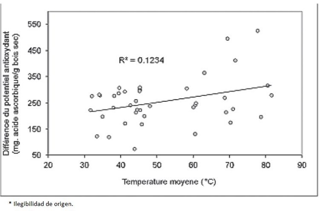 Conformément à ces résultats, nous pouvons dire que la capacité antioxydant et les pics à 1741 cm-1 sont directement en corrélation puisqu'une perte plus importante du potentiel antioxydant correspond à une présence plus importante en carbonyle plus importante (groupes chromophores). On peut donc supposer que la couleur du bois de chêne européen thermiquement modifiée est le résultat de la production et/ou destruction des groupes chromophores. L'effet de la température sur le potentiel antioxydant est démontré dans la Figure 8. La perte en puissance antioxydante augmente avec la température. Les composés phénoliques sont de couleur rougeâtre, la dégradation des ellagitanins provoque donc une couleur jaunâtre du bois par effet thermique. L'augmentation de la saturation et de la luminosité peut être liée à la dégradation thermique des extractibles (principalement les ellagitanins).