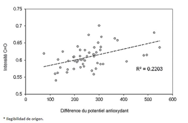 Dans la Figure 7, nous présentons les valeurs du potentiel antioxydant et l'intensité C=O. Le Delta du potentiel antioxydant représente la différence entre le potentiel initial et le potentiel final pour chaque échantillon. Nous pouvons remarquer que le Delta du potentiel antioxydant augmente en même temps que C=O augmente. Le potentiel antioxydant est lié au contenu des extractibles car les groupes phénoliques sont des antioxydants puissants. Parmi les extractibles antioxydants, les ellagitanins et les gallotanins sont les plus importants. Les ellagitanins contribuent à la formation de l'oxydation des produits (groupes chromophores); ce fait a été confirmé par une présence plus importante d'entités carbonyles dans les surfaces de bois identifiés par spectroscopie. Les ellagitanins peuvent être hydrolysables en présence d'eau libre et de chaleur, même à basse température, par conséquent, il est possible de produire de l'acide gallique, de l'acide ellagique et du glucose durant le processus de séchage.