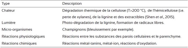 Le séchage du bois de feuillus pose plus de problèmes au niveau des changements de couleur par rapport au bois résineux. Les espèces de bois de feuillus sont plus sensibles à la discoloration (Alexiadis, Cohen, Kozak et Avramidis, 2007). De plus, en ce qui concerne les bois de feuillus de grande valeur sur le marché européen, certaines caractéristiques d'apparence telles que la couleur et son l'homogénéité sont des critères très importants (Sandoval-Torres, Marc, Jomaa et Puiggali, 2010). Dans le Tableau 1, nous résumons les principales causes de discoloration dans le bois.