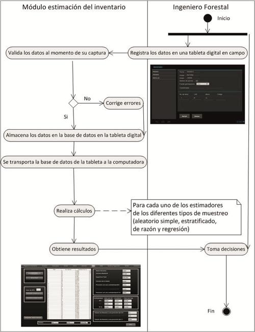 El sistema propuesto cuenta con dos módulos, el cálculo del inventario y el sistema de proyección maderable, ambos fueron rediseñados; el primero de ellos se adecuó para tener una mejor aproximación de las existencias en la plantación. Esto se hizo al agregar más tipos de muestreo para tener una mayor amplitud en la estimación y toma de decisiones en menor tiempo y sin tanta manipulación de datos (Fig. 2).
