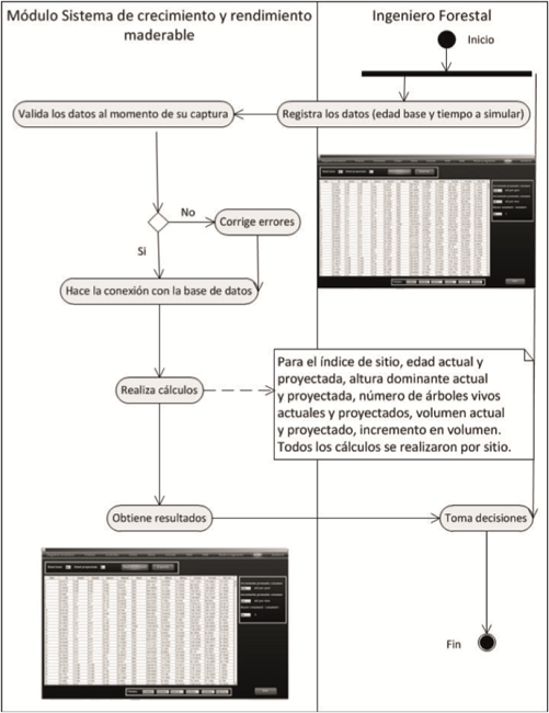 El segundo módulo, hace la proyección maderable de la plantación, proporciona una estimación futura de los recursos y deja listos los datos para hacer una planeación adecuada de los mismos (Fig. 3). En ambos casos, el propósito inicial fue lograr la simplicidad, la eficiencia y la facilidad de uso de la información en el sistema.
