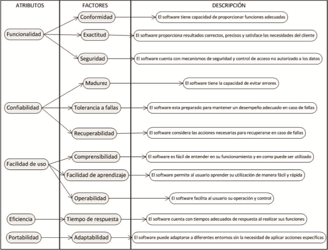 Para la evaluación del software se aplicó la metodología propuesta por Gómez-Reynoso, Muñoz-Andrade y Macías-Díaz (2010), la cual se centra en el concepto de calidad orientada al uso y satisfacción del usuario, sugerida por Ramani (2007). Esta técnica integra los atributos de los modelos de calidad (McCall e ISO 9126) y establece qué factores deben evaluarse, cómo deben medirse y en qué términos (Fig. 4). Para aplicar la prueba se crearon 22 preguntas y una escala de respuestas posibles (de 1 “Excelente” a 5 “Mala”).