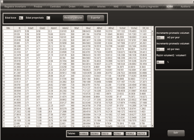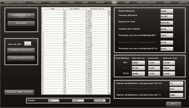 La presentación de los cálculos del inventario y el simulador maderable se realizó a través de pantallas gráficas de acceso cómodo, visualización simple y de fácil uso. La pantalla del inventario contiene las opciones para registrar información (predios, contratos, órdenes, sitios y árboles) y para calcular los totales, estimadores e inventario de las variables evaluadas para los cuatro tipos de muestreo (Fig. 6).