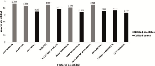 De los once factores de calidad se encontró que 55% de los mismos presenta un nivel de calidad buena y que 45% cumple con una calidad aceptable (Figura 8). Gómez-Reynoso et al (2010) encontraron que al integrar al usuario en la evaluación, se incrementó la calidad del software significativamente, en 10 de los 11 factores analizados.