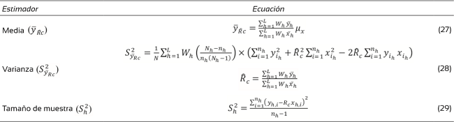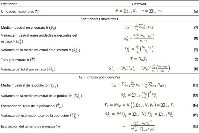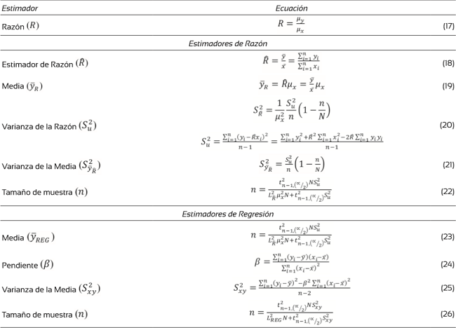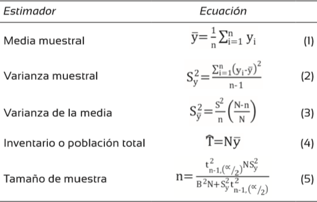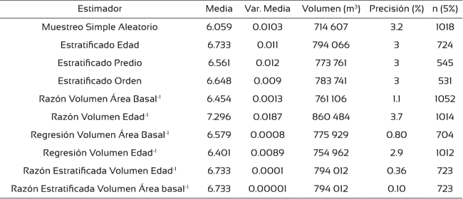 Los estimadores usados en el cálculo del inventario pertenecen a un muestreo simple aleatorio (Tabla 1), aleatorio estratificado (Tabla 2), de razón y regresión (Tabla 3) y (Tabla 4) razón bajo estratificación. El volumen de árboles en pie se estimó a través de dos ecuaciones de volumen total con corteza (Roldan, 2013) ajustados para la zona (Tabla 5).