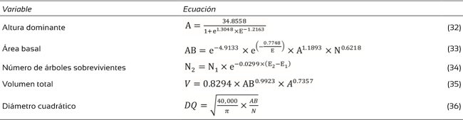 El conjunto de ecuaciones utilizadas pertenecen a un modelo explícito hecho especialmente para estas plantaciones; este modelo se encarga de proyectar componentes de altura dominante, área basal, supervivencia residual (mortalidad) y volumen total de la plantación en función de la edad y de sus interrelaciones como componentes del rodal (Tabla 6).