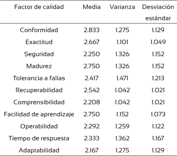 Lo resultados de la prueba de la calidad demostraron que el valor máximo del promedio correspondió al factor de conformidad, 2.883 y el valor mínimo 2.167, para el factor de adaptabilidad; el factor “mejor calificado” es aquel que tiene el valor más pequeño (Tabla 8).