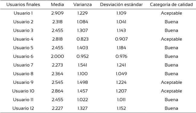 El cuestionario se aplicó a 12 usuarios finales quienes estaban capacitados en la realización de los cálculos y el análisis de resultados. Los resultados obtenidos de los cuestionarios se analizaron mediante estadística descriptiva con base en los factores y escalas definidos; los valores de las medias se calificaron de acuerdo con las siguientes categorías de calidad, para valores entre 1.000 y 1.500 como “Excelente”, de 1.501 a 2.500 como “Buena”, de 2.501 a 3.500 como “Aceptable” y cualquier valor superior a 3.500 fue considerado como “No aceptable”.