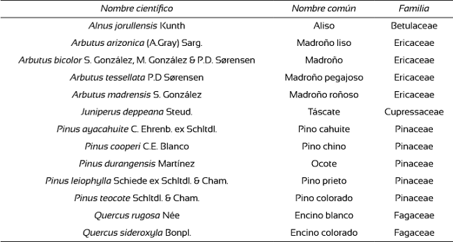 Se muestrearon un total de 1967 árboles con diámetro a la altura del pecho mayor o igual a 7,5 cm, pertenecientes a 13 especies, distribuidas en cinco géneros y cinco familias de árboles (Tabla 1). La familia más representativa fue Pinaceae con cinco especies: P. ayacahuite, P. cooperi, P. durangensis, P. leiophylla, P. teocote; seguida de Ericaceae con cuatro especies. Juntas, estas dos familias incluyeron dos géneros y nueve especies, lo que constituye 64,29% de la composición arbórea registrada en los 10 sitios de muestreo.