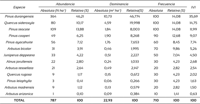 El índice de valor de importancia define cuáles de las especies presentes contribuyen en el carácter y estructura de un ecosistema (Cottam y Curtis, 1956). Las especies P. durangensis (35,69%), Q. sideroxyla (14,75%) y P. teocote (11,99%) fueron las especies más sobresalientes, al registrar los valores más altos sumando 62,43% del total de la comunidad. La especie más rara fue A. arizonica, presentando valores por debajo de uno por ciento (Tabla 3).