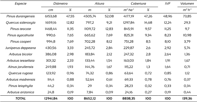 El IVF está conformado por los valores relativos del diámetro, altura y cobertura de las especies del área. El diámetro relativo mayor fue para P. durangensis con 47,55% seguido de Q. sideroxyla y P. teocote con 12,82% y 11,35% respectivamente. La mayor altura la presentó P. durangensis con 52,08% seguida de P. teocote con 12,83%. La cobertura de copa en el área fue de 8838,35 m2 por hectárea, lo que indica que existe menos del 100% de la superficie cubierta por el dosel. P. durangensis y Q. sideroxyla fueron las especies con mayor cobertura al abarcar 5475,03 m² por hectárea, que equivale a 61,94% de la cobertura de copa de todas las especies en el área de estudio. La especie P. durangensis presentó el mayor IVF. En relación al volumen, el área de estudio presentó 173,46 m3 por hectárea. Las especies que resultaron con mayor volumen fueron las mismas que obtuvieron el mayor IVI e IVF. La especie P. durangensis fue la especie con mayor volumen (73 m3 por hectárea) seguido de Q. sideroxyla (29,30 m3 por hectárea) (Tabla 4).