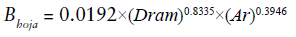 Los modelos propuestos para la estimación de estos componentes aéreos de biomasa fueron los de mejor ajuste, ya que presentaron parámetros estadísticos significativos (α = 0.05) y errores estándar pequeños. La biomasa de tallo+corteza (Bf) y de ramas (Br) se estimó en función de DN y AT bajo el modelo de la variable combinada generalizada; las variables involucradas en el modelo predicen 97% y 93% de la variabilidad existente en la biomasa de esos compartimentos respectivos. La variabilidad de biomasa en hojas (Bh) se puede predecir en 98%, utilizando diámetro normal y altura del árbol en un modelo lineal mezclado (Tabla 1).