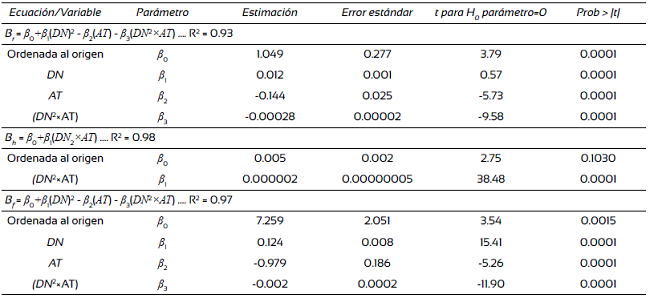 Por otra parte, Fonseca et al. (2009) obtuvieron R2adj = 0.82 con el DN como única variable para estimar biomasa en plantaciones y bosques secundarios en Costa Rica; mientras que en Oaxaca, Acosta-Mireles et al. (2002) encontraron valores de R2 entre 0.97 y 0.99 usando solamente DN para especies como Liquidambar, Rapanea, Quercus y Clethra, al igual que Deans, Mora y Grace (1996) en especies tropicales. Valores bajos en la confiabilidad y bondad de ajuste del modelo indican que es necesario añadir la AT como variable predictora, ya que los modelos generados en este trabajo estimaron confiablemente la biomasa con las dos variables ya mencionadas.
