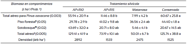 Todos los compartimentos presentaron diferencias de biomasa acumulada en los tratamientos silvícolas (p ≤ 0.05); la mayor cantidad de biomasa aérea de P. oaxacana se presentó en el tratamiento AP+R10 que contiene la mayor densidad (2892 árboles ha-1) y la menor cantidad de biomasa en el piso forestal (Tabla 4).