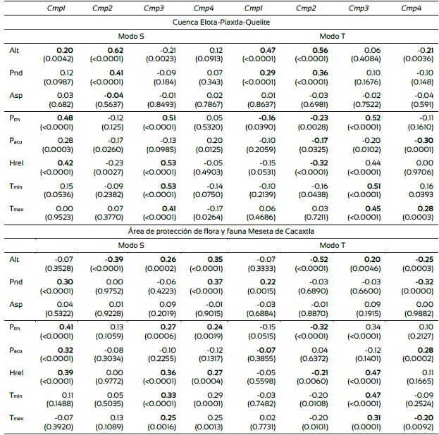 En el análisis a escala de cuenca, el mapa de la altitud presentó correlaciones positivas significativas con los mapas de cargas de los dos primeros componentes del ACP en el modo S y con los mapas del primer, segundo y cuarto componente en el modo T. El mapa de cargas del segundo componente del modo S, a pesar de asociarse a variaciones temporales aleatorias, estuvo correlacionado con los mapas de las tres variables topográficas. En el análisis a escala del Apffmc, la altitud y la pendiente presentaron correlaciones significativas con el segundo, tercer y cuarto componente en ambos modos y la pendiente con el primer y cuarto componente también en los dos modos (Tabla 2).