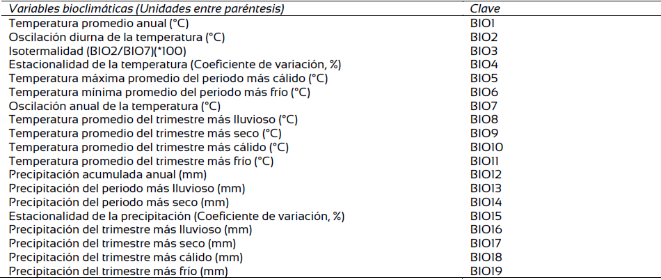 Se descargaron las 19 variables bioclimáticas de Worldclim ver. 2.0 para el periodo presente (1970-2000) (Fick y Hijmans, 2017) y futuro de los modelos de circulación global CRNMCM5 (Centro Nacional de Investigaciones Meteorológicas de Francia) y HADGEM2_ES (Centro Meteorológico Hadley del Reino Unido). Estos MCG fueron generados a partir de modelos regionales del proyecto de intercomparación de modelos acoplados fase 5 (CMIP5) con dos forzamientos radiactivos de 4.5 (trayectorias de CO2 constantes) y 8.5 (trayectorias de CO2 altas) para 2041-2060, tienen una resolución espacial de 1 km2 y un formato GeoTiff (Tiff) (Worldclim, 2018).
