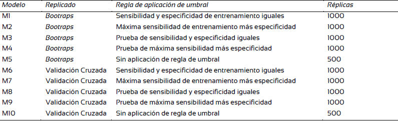 De los 10 modelos probados, el 7 presentó el mejor ajuste estadístico. Este modelo fue generado mediante un replicado interno tipo validación cruzada, regla de aplicación de umbral de máxima sensibilidad de entrenamiento más especificidad y 1000 réplicas.