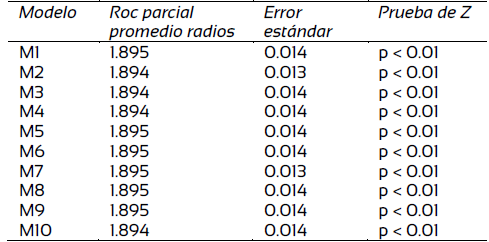 Los valores del ABC de la prueba de ROC fueron de 0.983 a 0.984 para el entrenamiento y de 0.960 a 0.970 para la validación, lo cual indica que el desempeño de los modelos fue excelente. Los resultados de las pruebas de Roc parcial y Z presentaron un desempeño estadístico excelente (Tabla 4).