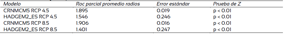 Los resultados de las pruebas de Roc parcial, error estándar y Z indican un mejor ajuste en las trayectorias RCP para el modelo de circulación global CRNMCM5 en comparación con las trayectorias del modelo HADGEM2_ES.