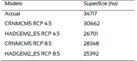 En la Tabla 5 se describe la superficie actual y la estimada para el bosque subalpino de Pinus hartwegii Lindl de los dos modelos de circulación global probados para 2041-2060.