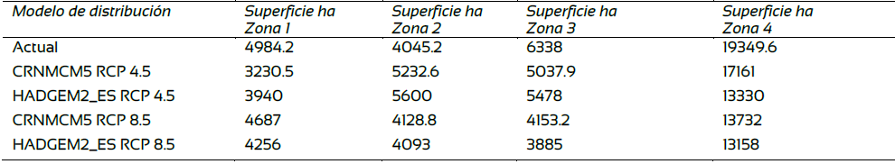 En la Tabla 6 se puede observar que los modelos bajo escenarios de cambio climático predicen que las zonas 3 y 4 serían las más afectadas por los efectos del cambio climático a futuro.