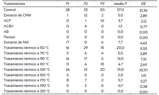 En la Figura 7 se puede observar que todos los tratamientos, en comparación con el control, mostraron eficacia, reduciendo significativamente el ataque de los insectos, excepto los tratamientos térmicos de 50 °C, 90 °C y 130 °C, en que los especímenes fueron severamente atacados.