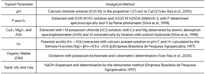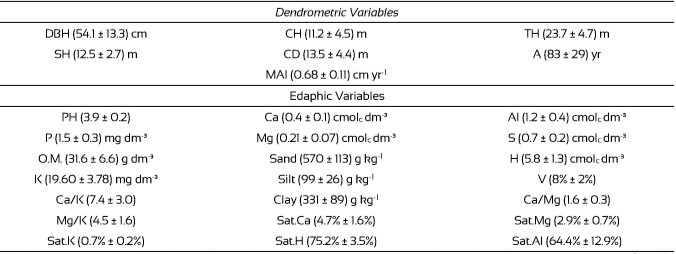 Around each tree four topsoil samples were collected to obtain a representative sample. The collections were made in a crosswise orientation, approximately 3 m from each tree, to a depth between 10 cm and 15 cm, using a straight blade and a machete. Following collection, the topsoil was stored in plastic bags for two days before being sent for laboratory analysis. Eleven physical and chemical topsoil parameters were measured following procedures from Silva, Eira, Barreto, Pérez, and Silva (1998), and the Van-Raij, Andrade, Cantarella, and Quaggio (2001) (Table 1). Other topsoil parameters measured around each Copaifera spp. trees were: sum of bases (S), saturation of bases (V), Ca2+/Mg2+, Ca2+/K+, and Mg2+/K+ relationships, Ca2+ saturation (Ca sat), Mg2+ saturation (Mg sat), K+ saturation (K sat), H+ saturation (H sat), and Al3+ saturation (Al sat).