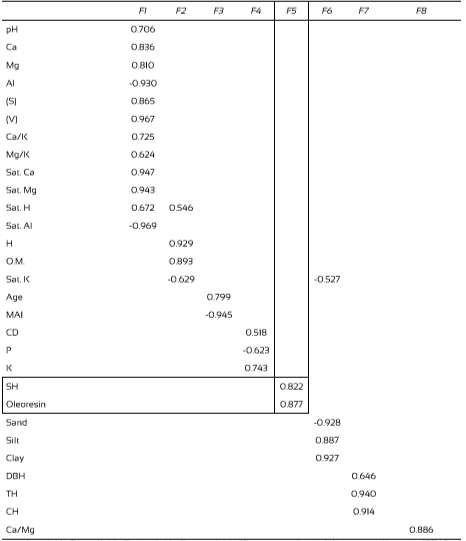 The relationships between dendrometric and edaphic variables, with the yield of Copaifera spp. oleoresin, were verified with a factorial analysis using principal components analysis (PCA). The PCA used a Pearson correlation matrix as input data, which was created from the variables shown in table 2. All factors with eigenvalue greater than one (latent root criterion) were retained. Next, the factors were rotated by the varimax method (orthogonal rotation) to simplify the factorial matrix and diminish ambiguities of the preliminary analysis, thus reducing the number of cross-loadings. Correlations between factors and variables were considered significant when the value of the factor loading was greater than or equal to 0.5 (Hair, Black, Babin, Anderson, & Tatham, 2009).