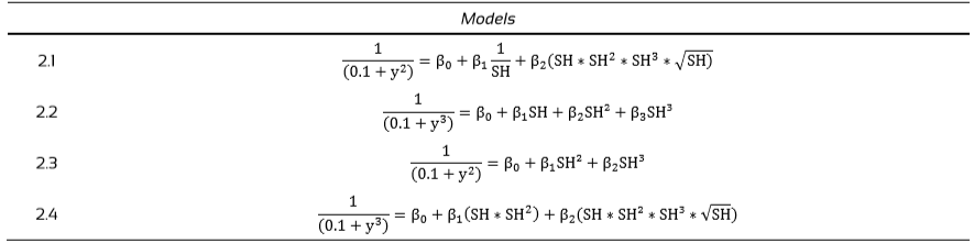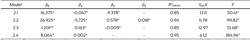 Although Models 2.2 and 2.4 presented better R2adjusted and SEyx% results than Model 2.1, Model 2.1 was selected as the optimal model for equation adjustment due to the lower residue amplitude for the trees with greater SH. Model 2.1 possessed the poorest R2adjusted and SEyx% parameters among the four models selected for analysis. However, Model 2.1 was considered the better model for adjusting an equation because the oleoresin yield estimate error of the tree with the highest SH was lower than the errors observed in the Models 2.2 and 2.4, as shown in figure 3. In the future, this will allow for a smaller error when other Copaifera spp. trees with similar characteristics are studied.