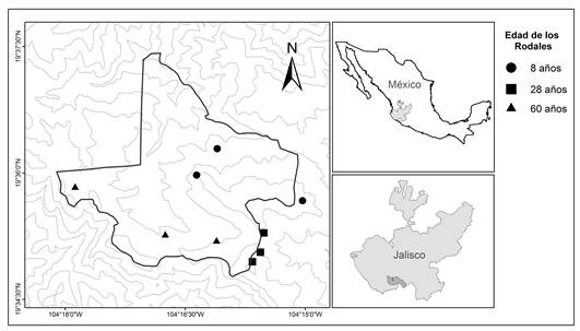 Los sitios de estudio (Fig. 1) se establecieron en los parches con afectaciones de alta severidad en los incendios de 1983 y 2003, 8 años y 28 años después del último disturbio ecológico; una tercera condición seleccionada como referencia, corresponde a rodales con aproximadamente 60 años de edad establecidos después de intervenciones intensivas de corta de madera, seguidas de incendios. Estos rodales tienen la mayor edad promedio en el área de estudio y en ellos el fuego ha estado excluido por más de 30 años (Jardel-Peláez, 2008).
