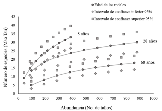 El índice de valor de importancia de las especies se estimó como el promedio de los valores relativos de abundancia, frecuencia y área basal. La riqueza de especies acumulada esperada se comparó con un método de rarefacción (Magurran, 2004) usando el programa EstimateS (versión 7.5). Los índices de diversidad de Simpson (1-D) y Shannon (H’) calculados con transformación ln, no cumplieron con el supuesto de homocedasticidad de varianzas, por lo que se analizaron por medio del método no paramétrico de bootstrap estimando los intervalos de confianza a 95%, usando 250 repeticiones, con el programa InfoStat (Di Rienzo et al., 2008). Las diferencias significativas entre categorías de edad de los rodales fueron inferidas al observar que no hubiera traslape en los intervalos de confianza. La diversidad β se calculó con el índice cuantitativo de Sørensen, basado en la abundancia de las especies de árboles (Magurran, 2004) en las tres condiciones de estudio con el programa PC-ORD 6.0 (McCune y Mefford, 2006).