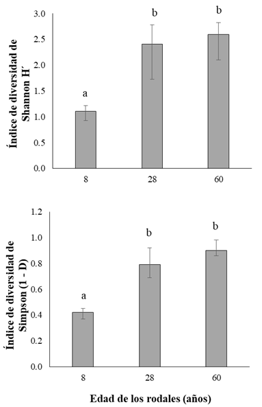 La riqueza y los índices de diversidad de especies arbóreas aumentaron con el tiempo postincendio. La riqueza de especies arbóreas fue de 18, 33 y 31 para los rodales de 8 años, 28 años y 60 años, respectivamente. El análisis de rarefacción mostró que a un mismo nivel de densidad de individuos (381 árboles, densidad menor) el rodal con 28 años presentó la mayor riqueza, seguido por los rodales con 60 años y 8 años de edad (33, 24 y 13 especies, respectivamente; Fig. 4). El índice de diversidad de Shannon (H´) fue menor en los rodales de 8 años, con un valor de 1.1 (IC 95% = 0.9-1.2), con un incremento a 2.4 y 2.6 en los rodales con 28 años y con 60 años, respectivamente (IC 95% = 1.7-2.8 y 2.1-2.8; Fig. 5). El índice de Simpson (1-D) tuvo un valor de 0.42 en los rodales con 8 años (IC 95% = 0.39-0.47), mientras que en los rodales de 28 años y de 60 años fueron de 0.79 y 0.90 (IC 95% = 0.66-0.89 y 0.82-0.94; Fig. 5).