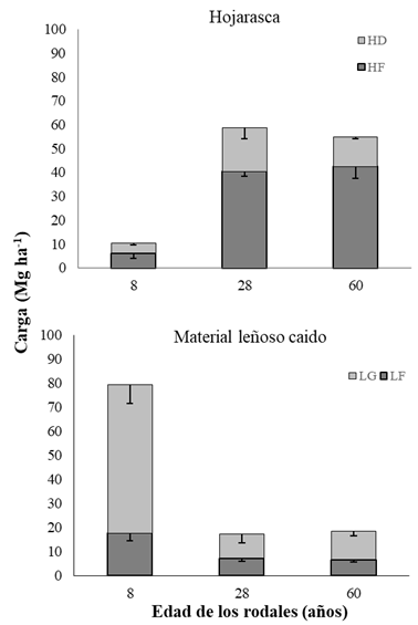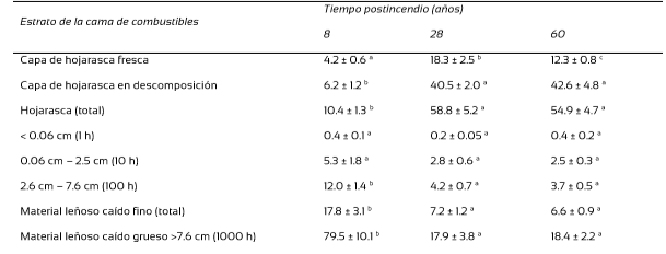 La carga de material leñoso caído grueso fue significativamente mayor en los rodales de 8 años que en los de 28 años y 60 años, debido al efecto de mortalidad de árboles durante los incendios del año 2003. Estudios que han cubierto cronosecuencias más largas, muestran un patrón general en forma de “U” en la variación temporal de la biomasa de material leñoso caído grueso: las cargas son altas después de incendios de remplazo de rodal, disminuyen en etapas intermedias de la sucesión y aumentan en rodales de viejo crecimiento (Harmon y Chen, 1991). Sin embargo, la ignición del material leñoso caído grueso depende de la intensidad del calor generado por la combustión de la hojarasca, que es el componente del complejo de combustibles que controla la iniciación y propagación de los incendios superficiales (Pyne et al., 1996).