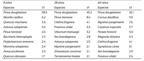 En los rodales de 28 años, las especies con mayor valor de importancia después de P. douglasiana fueron P. herrerae (VI = 8.4), y especies que exceptuando a A. xalapensis y Viburnum hartwegii Benth, forman parte del dosel del bosque mesófilo de montaña que predomina en las hondonadas y barrancos húmedos, como Clethra fragrans L. M. González y R. Ramírez, Fraxinus uhdei (Wenz.) Lingelsh e Ilex brandegeana Loes.