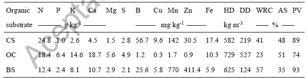 The DBS originates from the natural decomposition of the stem of the burity palm tree (Mauritia Flexuosa) and was collected in the municipality of Bom Jesus - PI. The CS (Copernicia prunifera) is the straw that results from extraction of wax from the leaf of this species and was collected in the municipality of Batalha - PI and OC was obtained from the composting of remnants of tree pruning and bovine manure. The physical-chemical characterization of the residues was performed according to the methodology described by Silva Júnior, Beckmann-Cavalcante, Silva-Brito, Avelino & Cavalcante (2014) and is shown in Table 1.