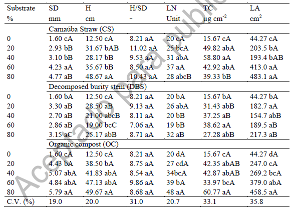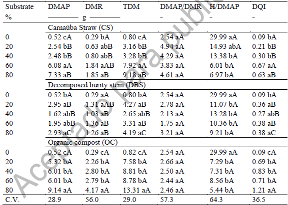 In the plants grown in substrates composed of a mixture of BS comparing the proportions, both DMAP and TDM presented the highest values in all mixtures, the lowest value observed in the substrate being formed by pure soil. On the other hand, in the substrates with OC in the mixture, the highest values of DMAP, DMR and TDM were observed at the proportion of 80% (9.14 g; 4.17 g and 13.31 g, respectively). The highest production of DMAP, DMR and TDM was observed at the proportion of 80% with organic compost. Its proportion of 60% equals that of carnauba straw (Table 4). They corroborate the result found by Nóbrega et al. (2008) that, evaluating the effect of adding the urban waste and liming in the initial growth of Enterolobium contortisiliquum found a higher production of DMAP in the substrate with a proportion of 80:20 (garbage: soil compost).