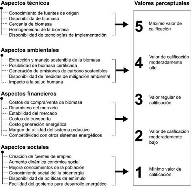 El estudio analizó el conocimiento básico del mercado de biomasa, para lo cual se enfocó en cuatro perspectivas: técnica, ambiental, financiera y social (Fig. 1), realizando en cada una, de cinco a siete preguntas. Estas preguntas buscaban una cuantificación de la respuesta; mediante una escala numérica del 1 al 5, en la que el valor 1 era el mínimo de conocimiento y 5 el máximo (las preguntas previamente se analizaron con la prueba de fiabilidad de Alpha de Cronbach, con un α = 0,871). Con los valores obtenidos, se aplicó la ecuación 1, con la cual se pudo normalizar el conocimiento analizado en una escala porcentua1, siendo 100% el valor máximo de concimiento: