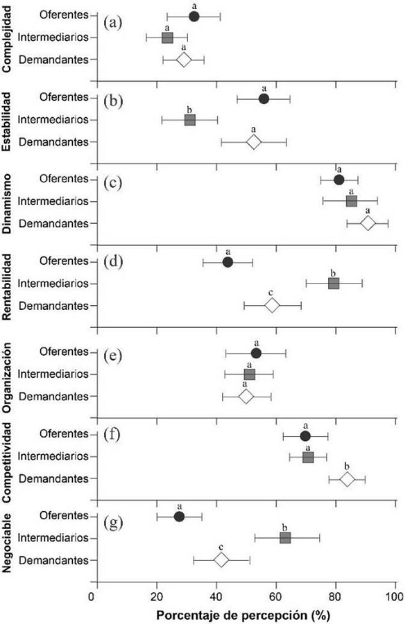 La percepción de mercado (Fig. 2) mostró cuatro comportamientos, según la pareja de adjetivos calificativos. Primeramente, no se encontraron diferencias entre los sectores productivos, para la complejidad del mercado, dinamismo y organización (Fig. 2a, 2c y 2e ). Los tres sectores mostraron una misma percepción, en el sentido de que el mercado es complejo, con una dinámica de oferta y demanda elevada y un sistema de organización bajo. El segundo comportamiento atribuido al sector intermediario mostró una percepción distinta a la de ofertantes y demandantes (ambos no mostraron diferencias significativas); esto se presentó con la variable de estabilidad de mercado (Fig. 2b), en la que los intermediarios mostraron que la percepción del mercado es poco estable con un valor de 36,5% en comparación con ofertantes y demandantes que mostraron una percepción moderadamente estable (promedio 56,6%). Lo anterior es debido a que el intermediario debe conectar a ofertantes y demandantes; de ahí que se considere que la localización de fuentes de biomasa sea más complicada que el proceso de venta directa de los ofertantes a los demandantes de biomasa.
