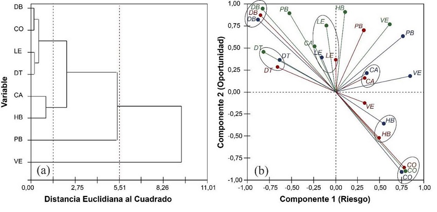 Al analizar las variables que los tres sectores consideran que afectan el mercado de biomasa (Fig. 3), inicialmente se encontró que las variables distancia de la biomasa al punto de uso (DB), costo de alternativas de energía competitivas (CO), limitaciones de las políticas estatales (LE) y disponibilidad tecnológica de transformación (DT) no mostraron mayor diferenciación entre criterios de los tres sectores (Fig. 3a), lo cual se evidenció con un distanciamiento eucleriano inferior a 0,23. Al analizar la variación interna de cada variable de este grupo (fig. 3b), se encontró para DB, que la posibilidad de mejora de esta condición tiene un riesgo bajo pero una oportunidad de incidencia en el mercado potencialmente elevada. Sucede algo similar con LE, en que se menciona que un apoyo gubernamental en cuanto al uso de biomasa o la mejora de las condiciones actuales de la venta energética tendría un potencial beneficio al mercado y con un riesgo negativo. Por su parte, con DT se mantiene la percepción de que una mejora en cuanto a la localización de la biomasa para la venta mejoraría el mercado y con un riesgo negativo, lo cual incidiría positivamente en el sector. Sucede lo opuesto con CO, una mejora de los precios de la energía implicaría un alto riesgo al mercado de biomasa y un beneficio negativo (imposibilidad de nuevas oportunidades de crecimiento).