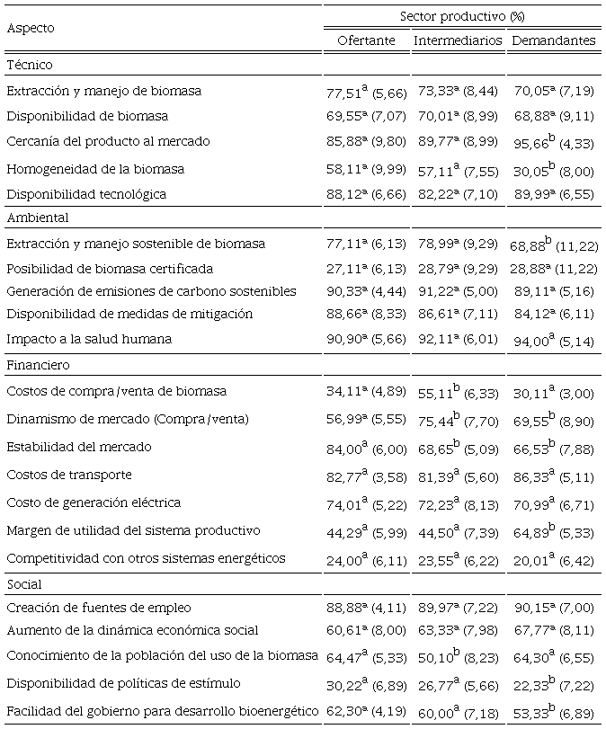 La caracterización inicial del mercado de biomasa desde la perspectiva de ofertantes, intermediarios y demandantes se presenta en la tabla 2. El análisis técnico determinó que en las variables: disponibilidad, tecnología, fuentes de extracción y manejo de biomasa no hay variaciones de la percepción entre los tres sectores productivos. Sin embargo, en cuanto a la cercanía de la biomasa al mercado, la homogeneidad y la disponibilidad de tecnología, se encontró una percepción diferenciada en dos agrupaciones: la primera conformada por productores e intermediarios y la otra por demandantes. Estos últimos consideraron que la cercanía de la biomasa es prioritaria, que no se cuenta con una homogeneidad de biomasa en el mercado y que el uso tecnológico es fundamental para la generación energética a partir de biomasa. Estos aspectos fueron distintos para ofertantes e intermediarios, quienes subestimaron los aspectos de distancia de las fuentes de biomasa, consideraron aceptable la heterogeneidad del mercado y también consideraron que la tecnología no es relevante.