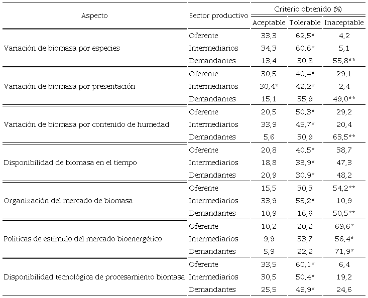 En cuanto a los aspectos de políticas del mercado de bioenergía y a la disponibilidad de tecnologías de procesamiento de biomasa, los tres sectores mantienen una homogeneidad de criterios; para la primera variable se considera que las políticas actuales son inaceptables, debido a que los precios fijados (los intervalos de negociación de precio son muy limitados) en el mercado imposibilitan o, en el mejor de los casos, limitan la venta de excedentes de generación eléctrica, propiciando que la mayoría de los demandantes de biomasa tiendan a modalidades de uso para el auto consumo, a la vez que ofertantes e intermediarios de biomasa cuentan con limitaciones en cuanto a la tramitología de los permisos necesarios para la realización de las operaciones. En el caso de los aspectos tecnológicos, se registra una percepción tolerable, pero queda clara la apreciación de que en el mediano plazo será necesaria una modernización tecnológica.