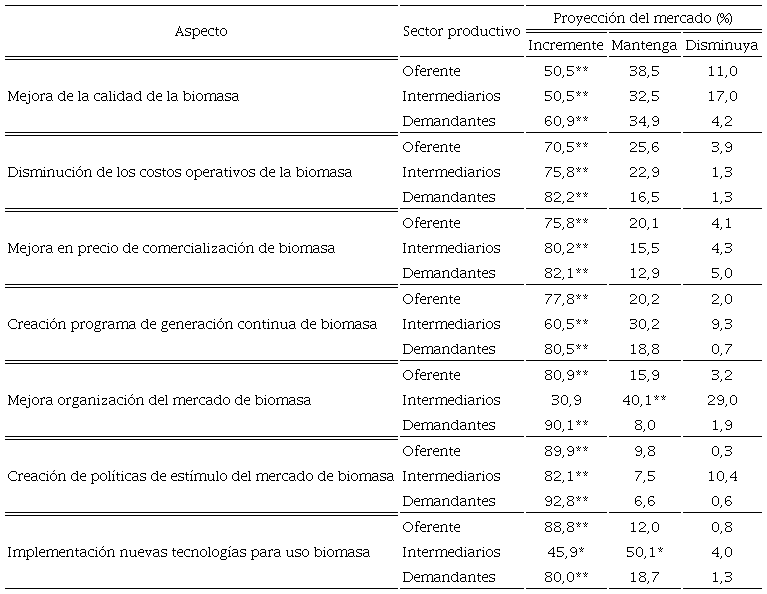 Al analizar las mejoras potenciales del mercado de biomasa (Tabla 3), se presentaron siete acciones, las cuales se examinaron desde el punto de vista de la posibilidad de incremento, manutención o decrecimiento del mercado en el mediano y largo plazo (Tabla 4). Al mejorar la calidad de la biomasa (creando categorías de calidad de biomasa y mejorando los sistemas de obtención y transformación de biomasa), la percepción mostró el mismo comportamiento con una expectativa de 53,6% de los sectores en que el mercado se incrementaría, mientras 34,0% consideraría se mantendría sin variación. Esto se debe a que, al tener una materia prima más homogénea, se dispondría de una mayor adaptación a las condiciones tecnológicas nacionales. Con las variables de diminución de costos operativos y mejora de los precios de comercialización de biomasa, se mantiene la tendencia de percepción de que el mercado crecería (más de 75% lo considera), ya que se tendría un mayor margen de ganancia para los distintos sectores a la vez que se permitirían reinversiones en los procesos.