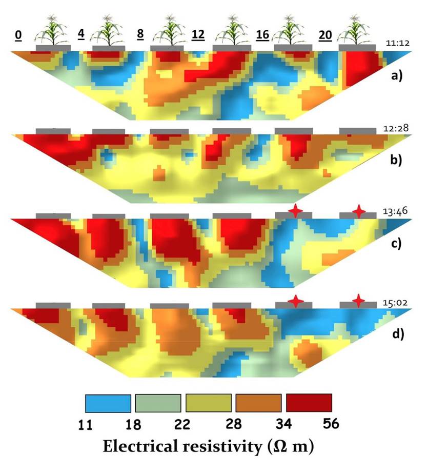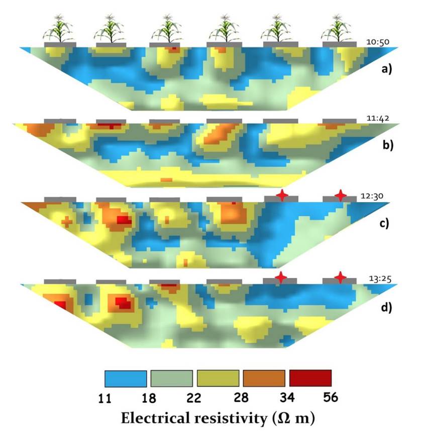 La sensibilidad de la resistividad eléctrica o la conductividad por el contenido de agua puede explotarse para explorar muchos fenómenos ecológicos y agronómicos (Jayawickreme et al., 2014; Rodriguez-Robles et al., 2017). En la agricultura, los métodos ERT y GPR se han propuesto como una técnica no destructiva para cuantificar y mapear la biomasa de las raíces, pero se necesita evidencia sobre la aplicabilidad de la técnica a baja densidad de raíces en cultivos agrícolas.