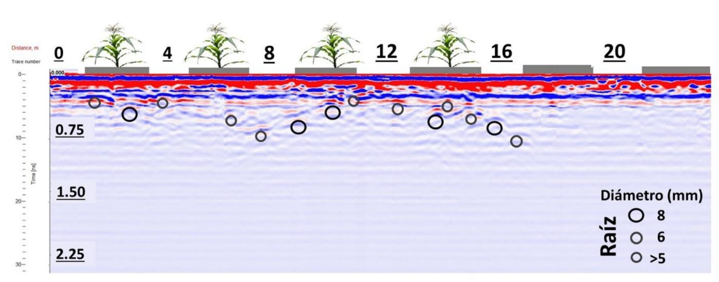 En la última década, los sensores geofísicos basados en la medición no destructiva de la conductividad eléctrica del suelo (o su resistividad inversa) se han utilizado ampliamente en la agricultura de precisión (Boenecke et al., 2018; Corwin y Lesch, 2005). Las imágenes ERT y GPR usadas en la investigación del subsuelo de baja profundidad, permiten elaborar una cartografía espacio temporal de la humedad mediante secciones horizontales y verticales para su mejor interpretación (Lunt, Hubbard y Rubin, 2005). A través del uso adecuado del agua y de fertilizantes, los rendimientos de las cosechas pueden optimizarse y la agricultura se vuelve menos dependiente de los patrones de precipitación (Jayawickreme, Santoni, Kim, Jobbagy y Jackson, 2011). Cuando se conjuntan ambos tipos de imágenes geofísicas para su interpretación se puede conocer la distribución de las raíces (diámetro, profundidad, elongación) y la ubicación de la capa freática o zonas de humedad, ajustando la dosis de fertilizantes de acuerdo con la cantidad de agua disponible en el suelo (von Hebel et al., 2014; Yoder et al., 2001).