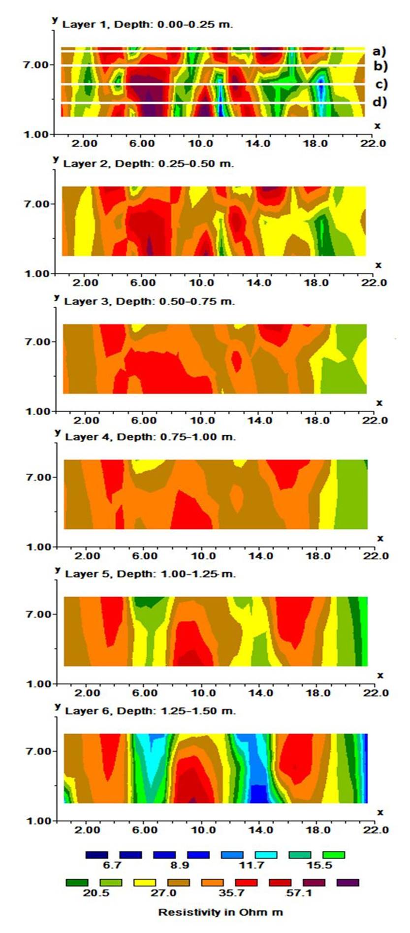 La figura 2 muestra una imagen ERT que fue levantada al día siguiente, tras un evento de precipitación de 21 mm, se puede observar detalladamente las zonas de mayor infiltración y cómo va cambiando la resistividad del suelo (56 Ω m a 22 Ω m), las regiones de mayor humedad se marcan en azul. Por otra parte, la imagen ERT 3D correspondiente al perfil ERT (Fig. 4) muestra cortes a cada 25 cm de profundidad en la que se muestran perfiles horizontales de la sumatoria de los cuatro perfiles que conforma la figura 2. En los primeros 25 cm se observa mayor variabilidad en los valores de resistividad, debido a las zonas de mayor evaporación y sumideros de agua, a diferencia del perfil más profundo (125 cm - 150 cm) donde los valores más bajos de resistividad se asocian a las zonas de retención de humedad por infiltración y flujos horizontales. Por lo tanto, como en toda exploración geofísica la interpretación de la imagen requiere de una calibración en el terreno (Barton y Montagu, 2004)