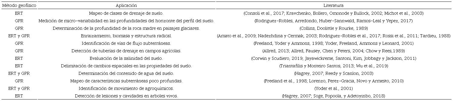 En el 2000, los métodos y herramientas geofísicas seguían siendo difíciles de acceder para usos más rutinarios debido a los altos costos de los equipos y la dificultad de las campañas de prospección, así como a la escasez de instrumentación adecuada para las mediciones superficiales del subsuelo. Los avances recientes en electrónica e instrumentación, adquisición y procesamiento de datos y visualización e interpretación de imágenes han reducido muchas de las limitaciones anteriores. A pesar de la necesidad de disponer de datos superficiales del subsuelo, la comunidad agrícola y forestal se ha mantenido en su mayoría sin conocimiento de los avances recientes en imágenes geofísicas que pueden beneficiar en gran medida su producción y el entendimiento de fenómenos ecológicos que se detonan en el subsuelo (Mares, Barnard, Mao, Revil y Singha, 2016; Rodriguez-Robles et al., 2017; Yoder, Freeland, Ammons y Leonard, 2001). Como profesionales estamos llamados a buscar estrategias que permitan superar los grandes retos, siendo clave para esto la incorporación de nuevas tecnologías que amplíen la visión integral del fenómeno de estudio. Las técnicas como el GPR y ERT pueden transcender cualquier campo, desde las biogeociencias hasta las ciencias forenses (Barone y Di Maggio, 2019; Cermak, Nadezhdina, Trcala y Simon, 2015; Khaldaoui, Djeddi, Zagh y Naa, 2017). Las aplicaciones de las imágenes geofísicas en las que los tomogramas-ERT y radargramas-GPR pueden proporcionar información valiosa para fines agrícolas y forestales se enlistan en la tabla 1.