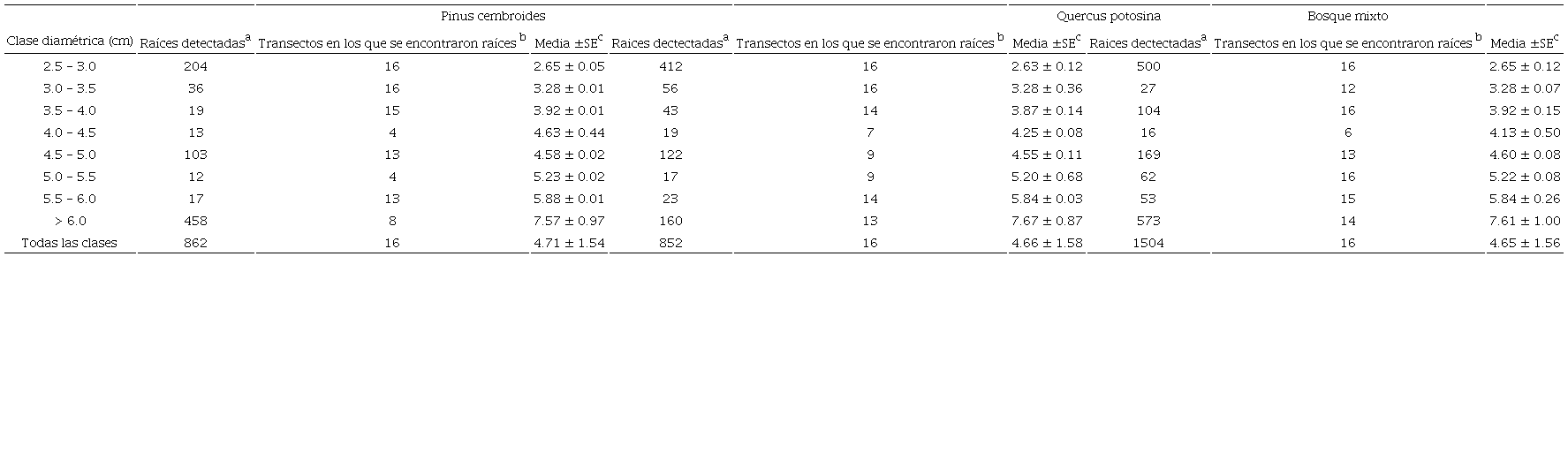 Finalmente, se analizó la distribución espacial de las raíces para los diferentes rodales, se muestra que el diámetro de la raíz tendía a aumentar a medida que aumentaba la profundidad del suelo en el caso de los rodales de pino puro (Figs. 6a, b). En contraste, el diámetro de las raíces, en los rodales de encinos puros, tienden a disminuir a medida que aumenta la profundidad del suelo (Figs. 6c, d), mientras que en los rodales mixtos observamos una tendencia a la disminución del diámetro en las raíces más profundas (Figs. 6e, f).