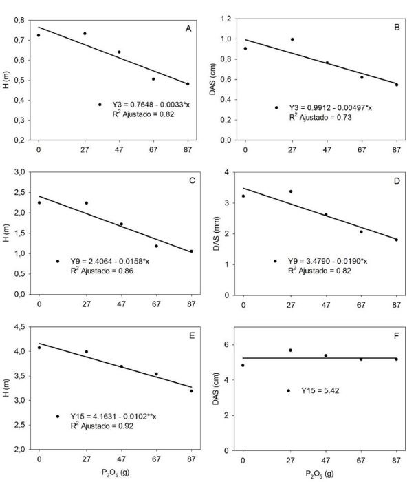 Se observó la misma tendencia a los 9 meses de crecimiento, el aumento de las dosis de P redujo linealmente el incremento de H y DAS de las plántulas de P. reticulata (Fig.2c, d). Los valores máximos de H y DAS fueron 2.40 m y 3.47 mm, respetivamente, observados en la dosis de 0 g de P2O5, con una reducción promedio de 31.6 cm y 3.8 mm en cada aumento de dosis de P.