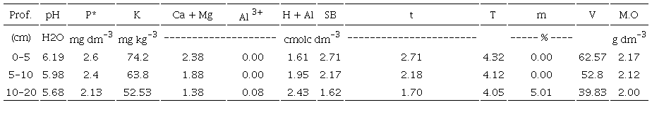 El suelo del área se caracteriza por Argisol amarillo distrófico (Sistema Brasileiro de Classificação de Solos [SiBCS] 2013). Antes de plantar, el área estaba cubierta de pasto con Pennisetum clandestinum. El control de las plantas espontáneas se llevó a cabo aplicando herbicida de glifosato en toda el área del experimento para facilitar las actividades de plantación y realización del experimento. Previo al experimento, se hizo una caracterización de atributos químicos del suelo (Tabla 1), de acuerdo con Donagema, Campos, Calderano, Teixeira y Viana (2011).