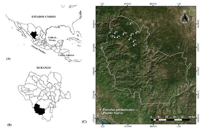 La presente investigación se desarrolló en la región de El Salto, Municipio de Pueblo Nuevo, localizado al suroest del estado de Durango, en las zonas elevadas de la Sierra Madre Occidental, en los paralelos 23°05´10”, 24°11´12” y los meridianos 105°11´19”, 105°55´50” latitud norte y longitud oeste (Fig. 1). La altura sobre el nivel medio del mar se ubica en el intervalo de 2492 m a 2644 m (Instituto Nacional de Estadística y Geografía [Inegi] 1984); presenta una precipitación media anual de 1300 mm y una temperatura de 18 °C (Inegi, 2009).